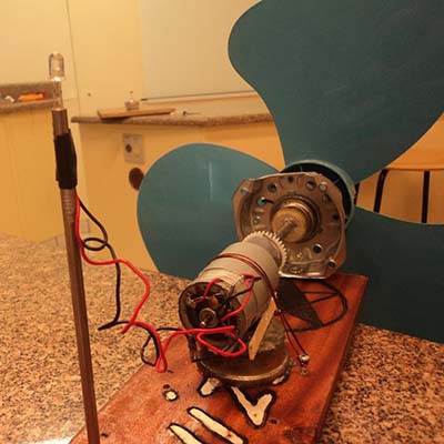 Retiramos motores de impressoras, DVDs, video-cassetes, e outros aparelhos eletrônicos quebrados e também diversos materiais que iriam para o lixo para construirmos geradores de energia eólica.