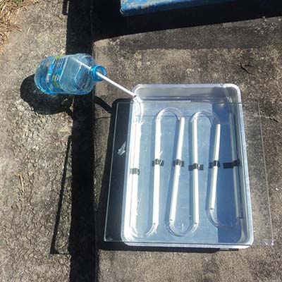 Fizemos um aquecedor solar, com o objetivo de esquentar água, feito com uma assadeira usada, pequenos pedaços de mangueira, alguns canos de metal pequeno e cola quente.