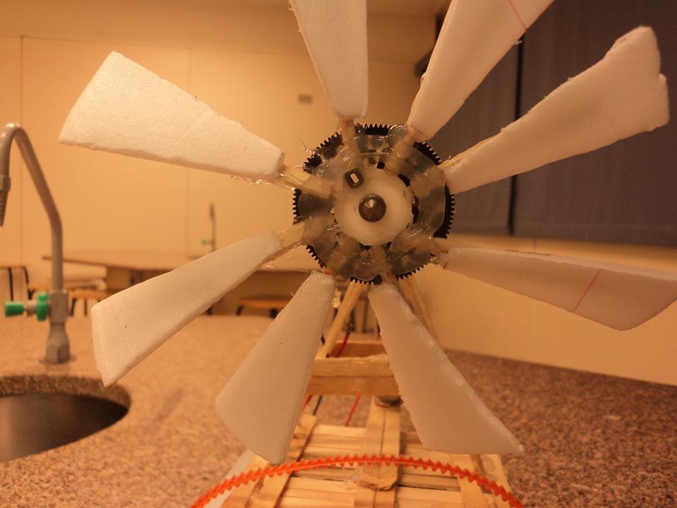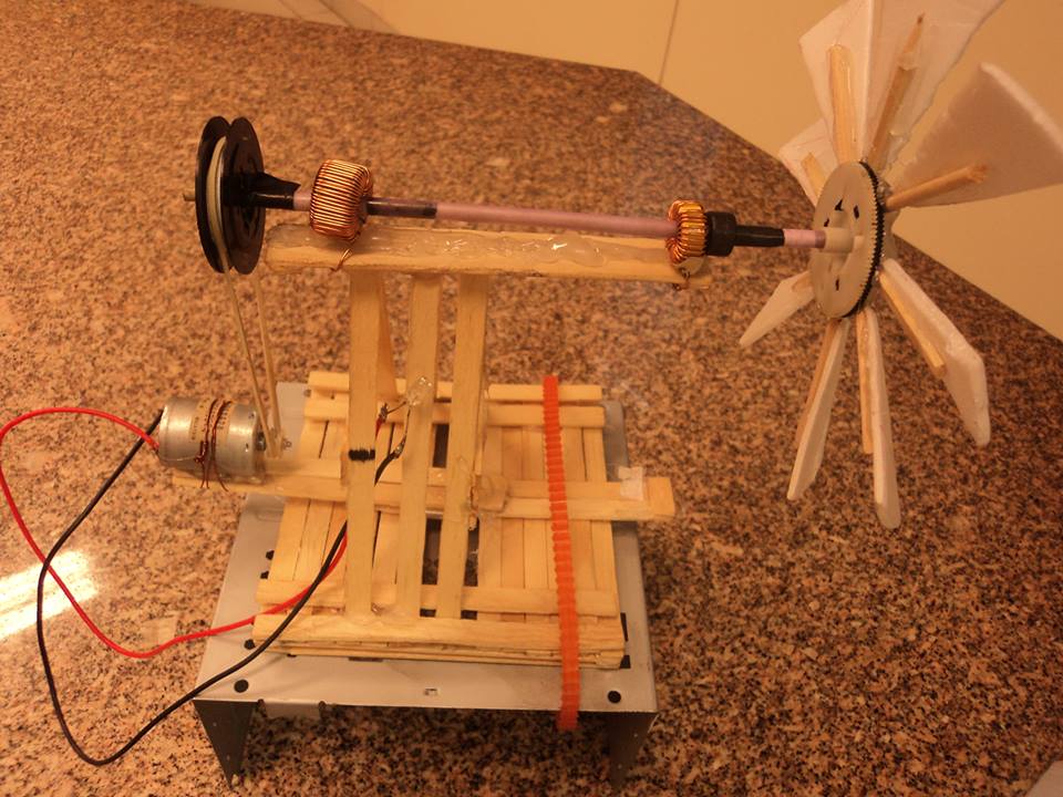 Conforme o vento bate na hélice, o eixo gira. O mesmo que está conectado ao motor por uma correia. Logo o motor acaba gerando eletricidade que por fim acende o LED - transforma-se energia mecânica em energia elétrica e a mesma é transformada em energia luminosa.